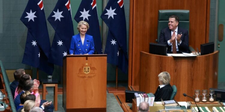 Canberra (AFP) – European Union chief Ursula von der Leyen and Australian Prime Minister Anthony Albanese struck a long-awaited free trade deal on Tuesday, compromising to boost exports in the face of global uncertainty over trade. Von der Leyen’s visit to Australia, with trade commissioner Maros Sefcovic in tow, comes as the 27-nation bloc and the import-reliant nation navigate renewed energy vulnerability sparked by the war in the Middle East. The accord is the latest agreed by Brussels in a push to diversify trade as Europe faces challenges from the United States and China. The two sides also inked an agreement to step up defence cooperation as well as critical raw materials.