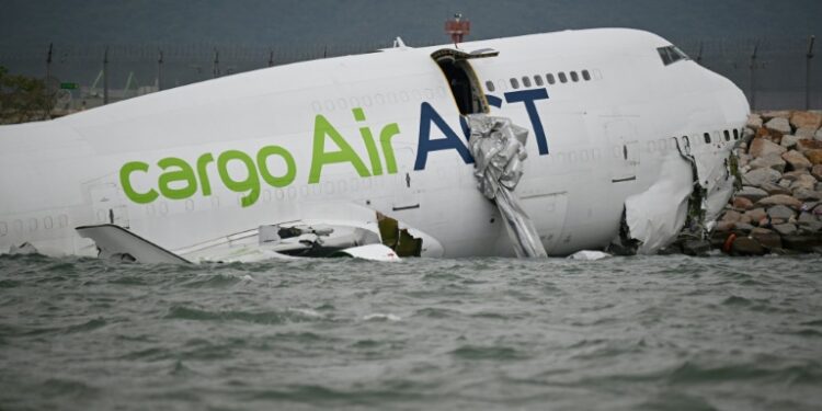 Hong Kong (AFP) – A cargo plane veered off a runway Monday during landing in Hong Kong, hit a security patrol car, and then skidded into the sea, leaving two men in the vehicle dead, authorities said. Officials said an investigation would aim to determine what caused the Boeing aircraft to leave the tarmac at Hong Kong International Airport, one of the busiest in the world for air cargo. The plane’s damaged fuselage was left partly submerged in the seawater that borders the airport, with its emergency evacuation slide extended following one of the most serious incidents since the hub began operations in 1998.