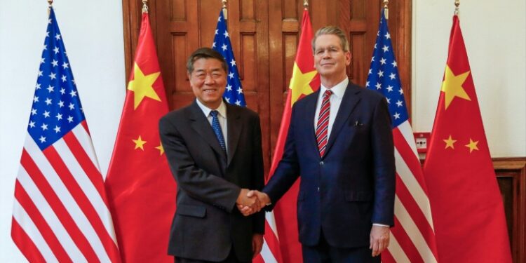 Chinese Vice Premiere He Lifeng (L) and US Treasury Secretary Scott Bessent and at their last meeting, in Madrid on September 14. ©AFP