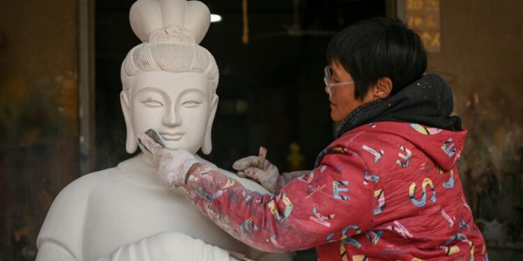 Suzhou (China) (AFP) – In a dimly lit workshop in eastern China, craftsman Zhang measured and shaped a block of wood into a foot as dozens of half-completed life-sized Buddha statues looked on silently. Zhang is one of a dwindling number of master woodcarvers in the village of Chongshan near the city of Suzhou, where generations of residents have made a living creating Buddhist and Taoist sculptures for display in temples across China.