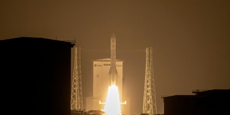 Kourou (AFP) – Europe’s most powerful rocket Ariane 6 successfully released 32 satellites into orbit Thursday for Amazon’s internet constellation, which is bidding to rival Elon Musk’s giant Starlink. The rocket blasted off into overcast skies at 5:57 am (0857 GMT) from Europe’s spaceport in Kourou, French Guiana, on the northeastern coast of South America.