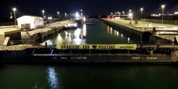 Dunkirk (France) (AFP) – Police arrested four Greenpeace activists on Monday for blocking a cargo ship in France that they alleged was transporting uranium from Russia for the country’s nuclear power plants. Around 20 protestors carrying signs reading “Stop toxic contracts” and “Solidarity with Ukrainians” blockaded the Mikhail Dudin at the northern port of Dunkirk early on Monday morning to prevent it from unloading its cargo, an AFP journalist observed. French authorities then arrested four individuals, Dunkirk police told AFP, adding that the blockade was lifted around 09:00 am (0800 GMT).