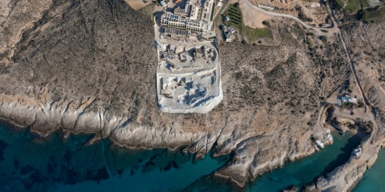 Milos (Greece) (AFP) – On the sloping shoreline of the Greek Aegean island of Milos, a vast construction site has left a gaping wound into the island’s trademark volcanic rock. The foundations are for a hotel extension that attracted so much controversy last year that the country’s top administrative court ended up temporarily blocking its building permit. Construction machinery still dots the site for a planned 59-room extension to the luxury resort, some of whose suites have their own swimming pools. Milos Mayor Manolis Mikelis calls the project an “environmental crime.” “The geological uniqueness of Milos is known worldwide. We don’t want its identity to change,” he told AFP in his office, adorned with a copy of the island’s most famous export, the Hellenistic-era statue of the love goddess Venus.