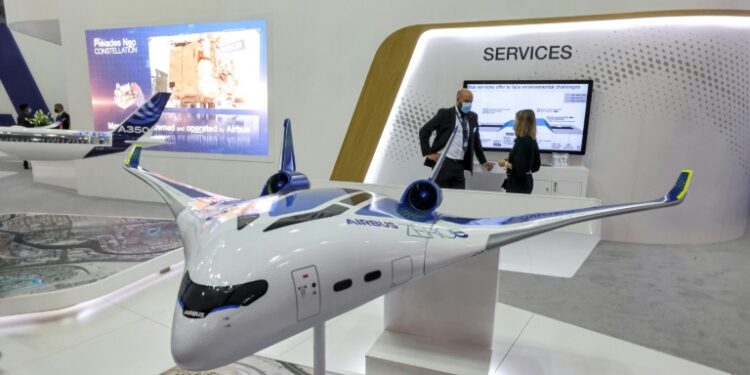 A model of an Airbus hybrid-hydrogen concept plane from 2021. ©AFP