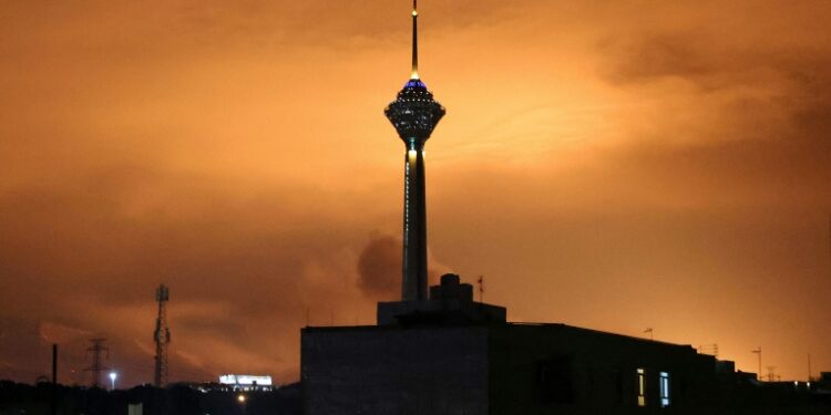Skies around Tehran's Milad (Birth) Tower, the tallest tower in Iran, are lit up following airstrikes on March 7, 2026. ©AFP