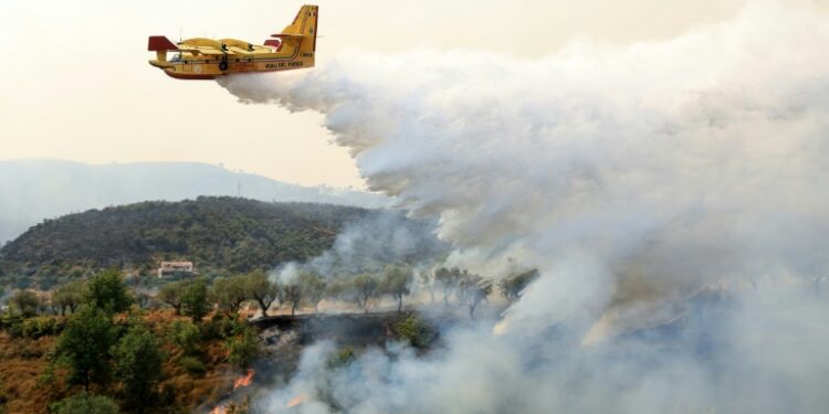 Canadair CL-415 planes, the workhorse of international aerial efforts to fight blazes, are making a comeback, like the one seen here over a 2025 wildfire in Albania. ©AFP