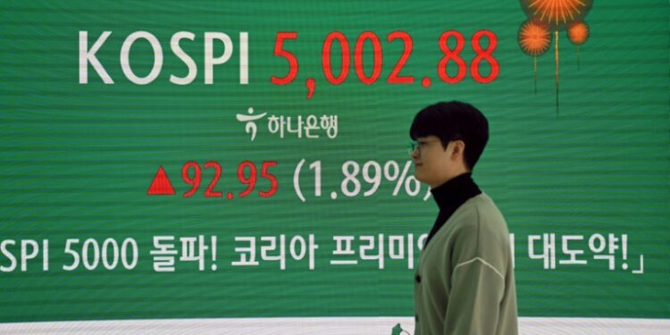 A man walks past an electronic screen showing South Korea's benchmark stock index surpassing 5,000 points in a foreign exchange dealing room at the Hana Bank headquarters in Seoul on January 22, 2026. ©AFP
