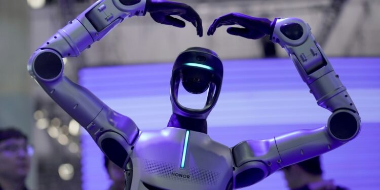 Chinese producer Honor is displaying what it calls a “robot phone” designed to function as a portable AI companion. The device has a camera on a small robot arm that acts as its head, which Honor said in a Sunday demonstration would be able to nod along with a conversation or look around in response to the user’s questions. The phone is set for launch in the second half of this year.