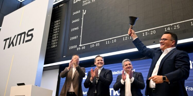 Frankfurt (Germany) (AFP) – Shares in Thyssenkrupp’s naval unit surged Monday as it was spun off from the German industrial giant, highlighting the buzz around European defence firms as the continent rearms amid a growing Russian threat. Submarine- and warship-maker TKMS, previously known as Thyssenkrupp Marine Systems, saw its share price jump from around 60 euros ($70) to over 80 in early trading in Frankfurt, giving the firm a valuation of over five billion euros ($5.8 billion).