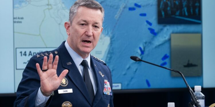 US Chairman of the Joint Chiefs of Staff General Dan Caine speaks as a map of the Strait of Hormuz is displayed during a press briefing. ©AFP