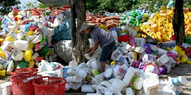 Hanoi (Vietnam) (AFP) – Crouched between mountains of discarded plastic, Lanh strips the labels off bottles of Coke, Evian, and local Vietnamese tea drinks so they can be melted into tiny pellets for reuse. More waste arrives daily, piling up like technicolour snowdrifts along the roads and rivers of Xa Cau, one of hundreds of “craft” recycling villages encircling Vietnam’s capital, Hanoi, where waste is sorted, shredded, and melted.